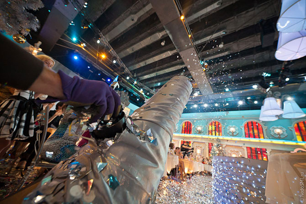 Блестки пускает специальный человек, добавляя их руками в воздушную пушку.