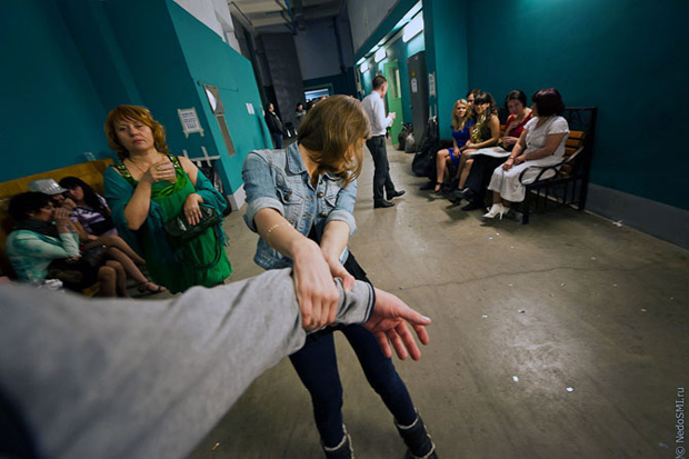 Пока сцена готовится к следующему номеру, массовка разминается в коридоре. Они пришли сюда по объявлениям на профильных форумах и сообществах к девяти утра, а уйдут в четыре часа утра следующего дня.