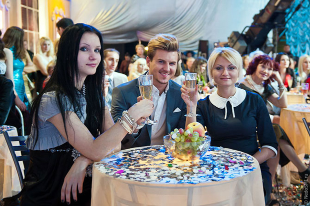 Жидкость из бокалов пить нельзя. Во-первых, это не шампанское, а лимонад. Во-вторых, даже то, что это лимонад массовке не говорят, называя содержимое «жидкостью с определенными химическими свойствами и добавками». Ну, а в третьих, в полных бокалах очень удобно тушить бенгальские огни.