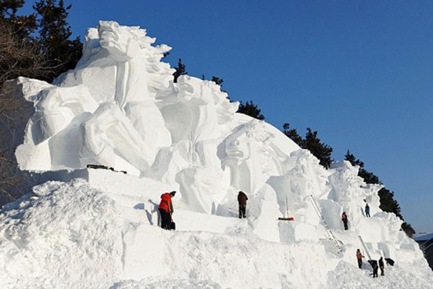 Так, на одной площадке поместились детализированный сказочный замок, основанием для которого послужил участок Великой китайской стены, и табун мчащихся лошадей рядом с русской церковью, скрупулёзно созданной с помощью больших объёмов снега и льда.