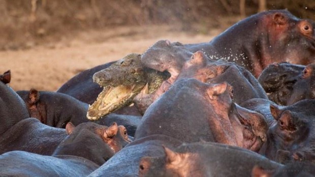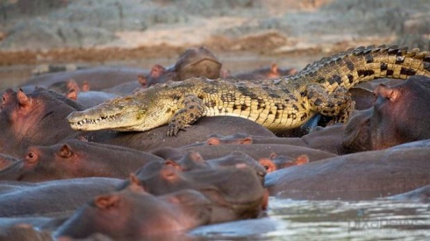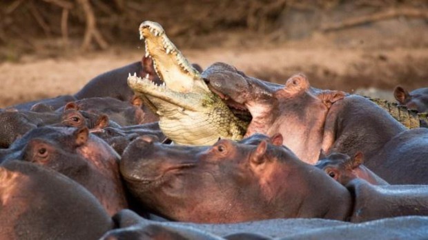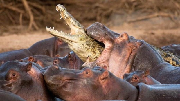 Крокодил решил взобраться на спины бегемотов, за что и поплатился: бегемоты набросились на него и разорвали. Крокодилу не помогли ни острые как бритва зубы ни твердый панцирь.