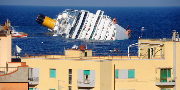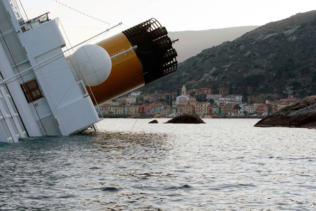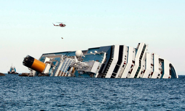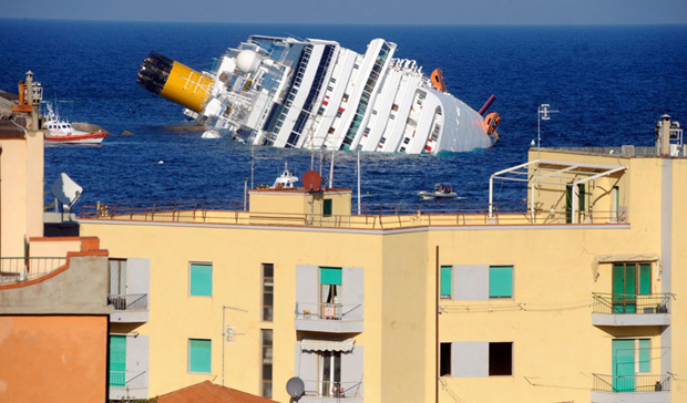 1. «Costa Concordia» после крушения у берегов острова Джильо. 6 пассажиров утонули, 14 все еще числятся пропавшими без вести, после того как итальянский лайнер с 4200 людьми на борту сел на мель. «Costa Concordia» отправилась на прогулку по Средиземному морю, но наткнулось на риф в пятницу 13 января. (Filippo Monteforte/AFP/Getty Images)