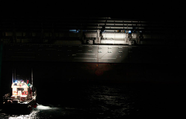 12. Спасательное судно освещает затонувший лайнер. (AP Photo/Gregorio Borgia)
