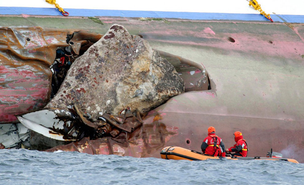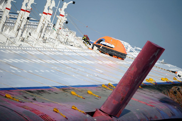 9. Пожарные осматривают огромные глыбы, торчащие из корпуса круизного лайнера «Costa Concordia» на следующий день после крушения. (AP Photo/Andrea Sinibaldi, Lapresse)