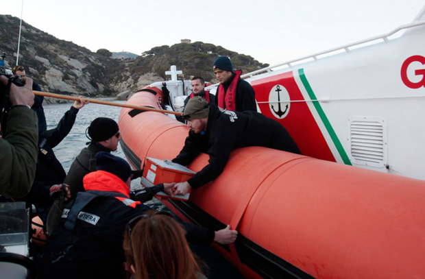 20. Итальянская береговая охрана с черным ящиком с лайнера «Costa Concordia». (AP Photo/Gregorio Borgia)