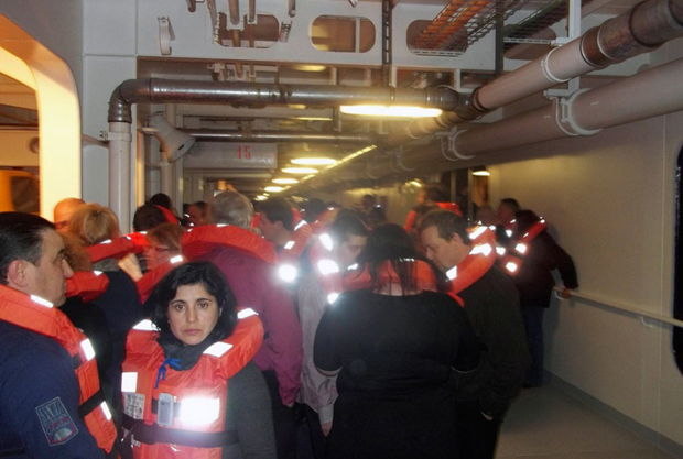 2. Пассажиры со спасательными жилетами на борту «Costa Concordia» ждут начала операции. (AP Photo/Courtesy from tourist aboard the ship)