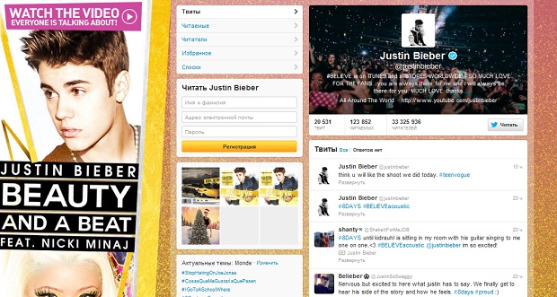 Джастин Бибер отобрал твиттер-первенство у Леди Гаги. Микроблог канадского исполнителя стал самым популярным в мире, набрав свыше 33,3 миллиона фолловеров, сообщает BBC. Американская поп-дива сохраняла лидерство с 2010 года, когда она сместила с пьедестала Бритни Спирс.