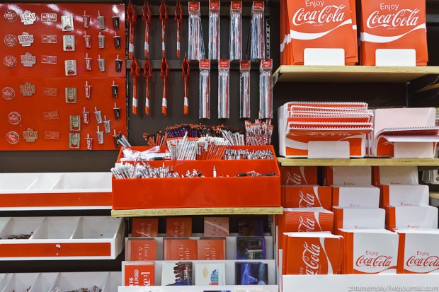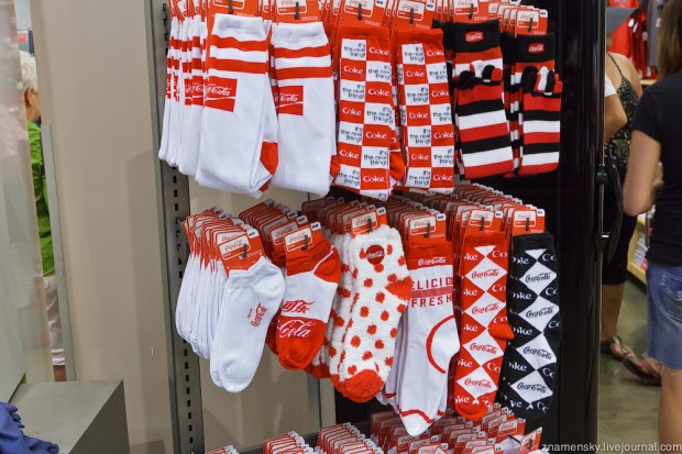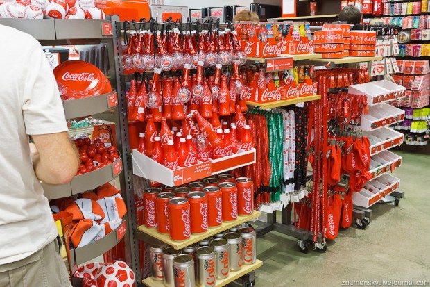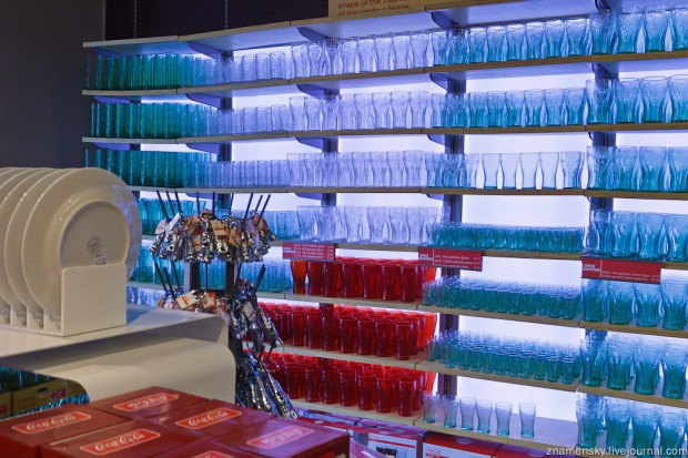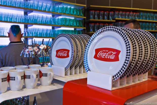 Для фанатов — огромный выбор всевозможных стаканов, тарелок и другой посуды с символикой Coca-Cola: