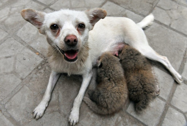 Недавно ощенившаяся собака усыновила двух детенышей красной панды, которых мать оставила вскоре после их рождения в зоопарке города Тайюань в северно-китайской провинции Шаньси. Детеныши панды приняли вторую маму и растут на собачьем молоке, но при этом щенки оказались брошенными. Снимок сделан 15 июля 2009. Два детеныша панды родились в зоопарке 25 июня, и были немедленно отвергнуты матерью из-за огромной толпы посетителей.