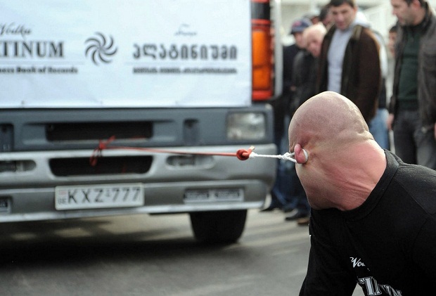 Позавчера 32-летний Лаша Патарая — чемпион Грузии по греко-римской борьбе — установил новый мировой рекорд в довольно странной «силовой» категории, сдвинув с места грузовик общей массой 8,28 тонн, при помощи одной лишь привязанной к уху верёвки.
