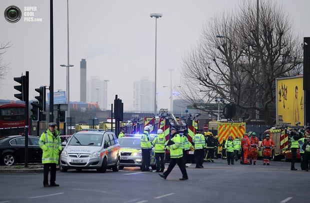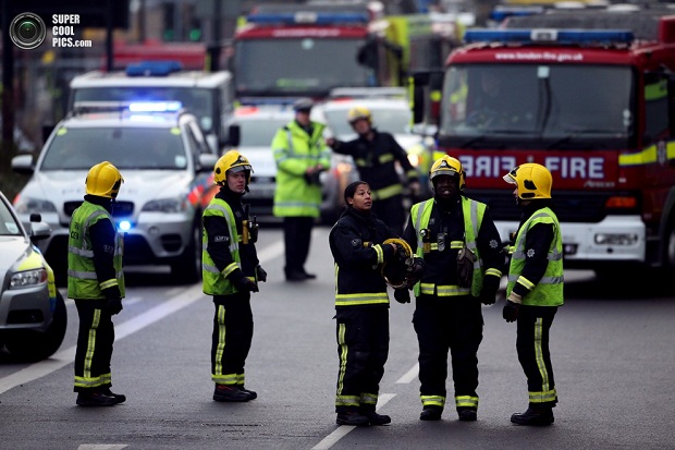 Работники спасательной службы стоят около места падения вертолёта, Лондон, Англия. (Dan Kitwood/Getty Images)