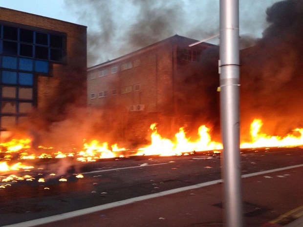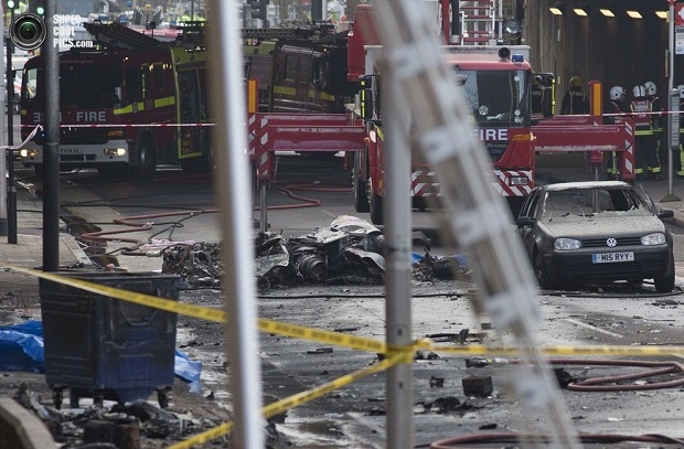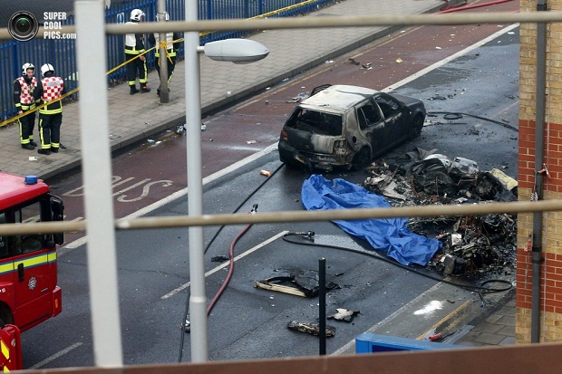 Вид сверху на обломки вертолёта и сгоревший автомобиль. (Oli Scarff/Getty Images)