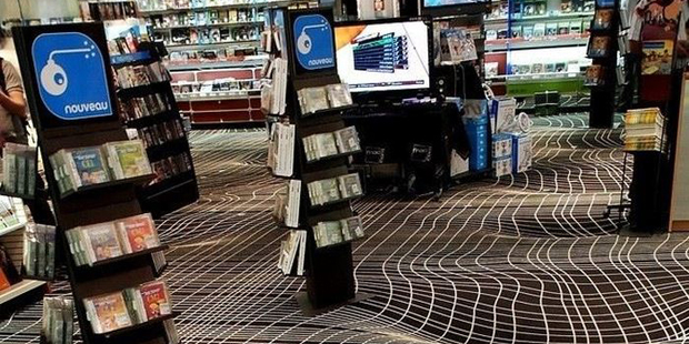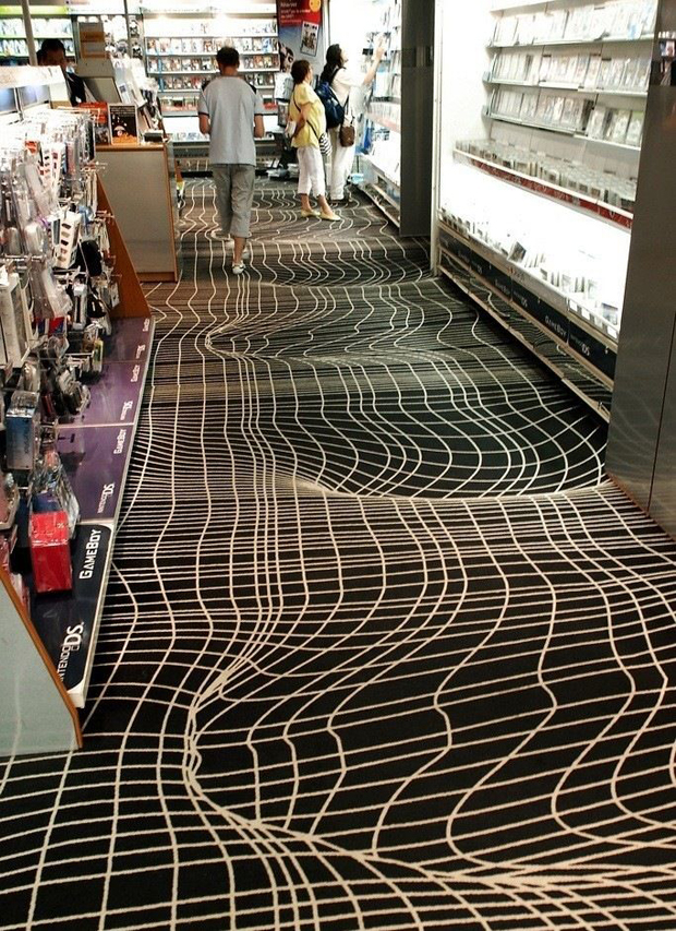Иллюзия очень часто используется для привлечения внимания, данный пост посвящен магазину, в котором на полу наклейка-иллюзия с кривыми линиями.