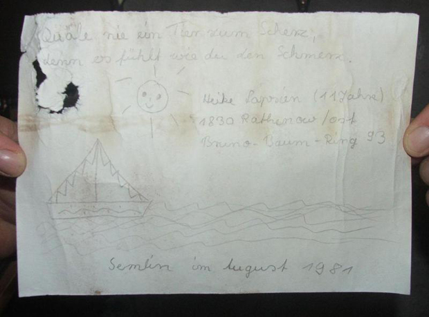В коротком письме Хайке написала следующее: Никогда не мучай животное ради забавы, потому что оно чувствует боль, как и ты. Далее на бумаге указано имя отправителя и его адрес. В настоящее время Лапсин не живет по тому адресу. Однако там живут ее родители, которые были рады пообщаться с нашедшими письмо Ланге.