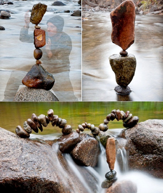 В руках художника, под его чутким руководством, камни, кирпичи, булыжники и речная галька способны проделывать умопомрачительные трюки, преодолевая гравитацию и выстраиваясь в невероятные инсталляции. Может показаться, что здесь не обошлось без помощи клея, веревки или проволоки, но нет, Майкл работает по-честному, так что балансирующие камни его лэнд-арта держатся в буквальном смысле на честном слове.