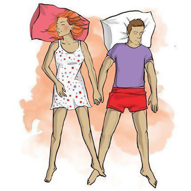 Так обычно спят возлюбленные, темперамент которых очень похож. Похожи они могут быть и внешне — ростом, телосложением… Об их ощущении безопасности свидетельствует то, что лежат они расслабленно на спине, но при этом должны иметь физический контакт.
