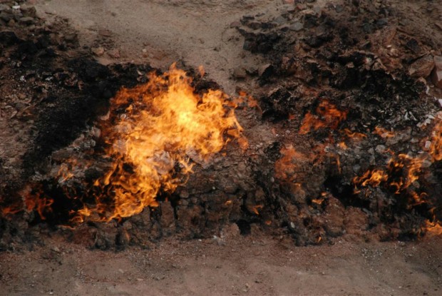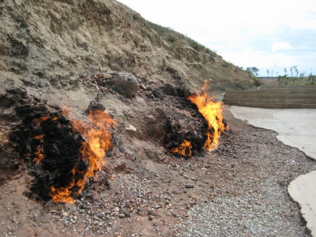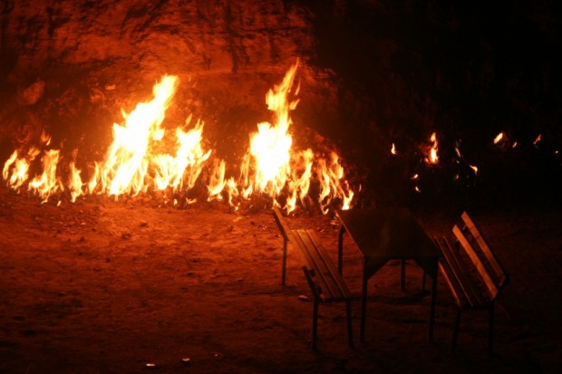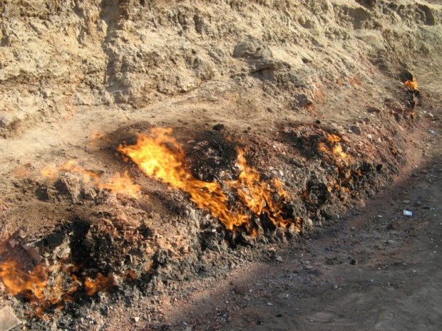 Гора горит и в дождь, и в снег, и при сильном ветре, потому что из ее глубин вырывается природный горючий газ. Он здесь поступает из тонких пористых слоев песчаника. В древности таких мест естественного извержения огня из-под земли на Апшероне было много.