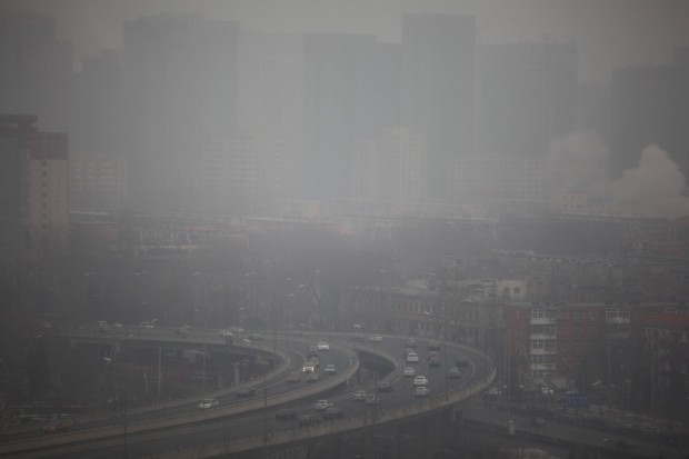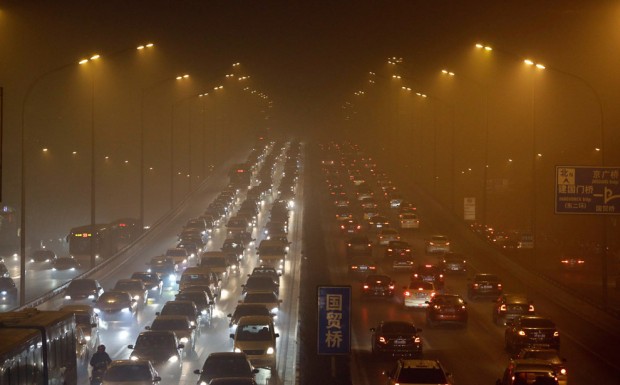 Автомобили движутся в густом тумане по третьей кольцевой автодороге Пекина, 12 января 2013 года. По данным исследования Пекинского университета и организации «Гринпис», в 2012 году загрязнение воздуха стало причиной преждевременной смерти 8600 человек в четырёх китайских городах и принесло экономические убытки в размере 1 миллиарда долларов США. (Jason Lee/Reuters)