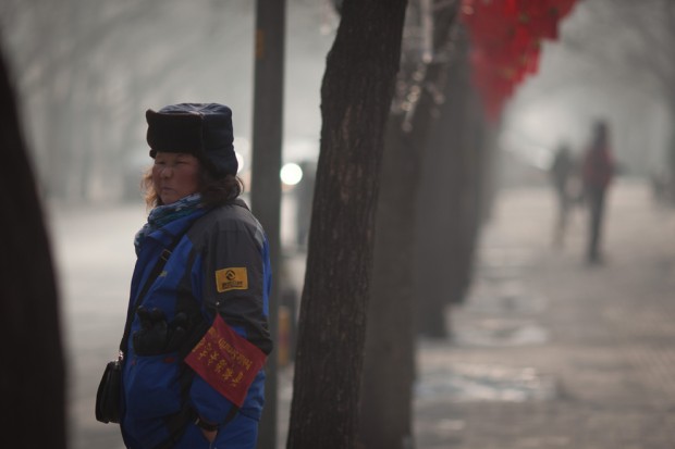 Парковщица стоит у дороги в сильном тумане в Пекине, 12 января 2013 года. (Ed Jones/AFP/Getty Images)