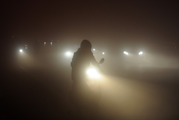 Мужчина едет в сильном тумане в Хэфэе в провинции Аньхой, Китай, 14 января 2013 года. (AFP/Getty Images)