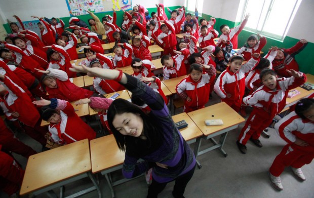 Учительница делает с детьми зарядку на перемене в школе в городе Цзинань в провинции Шаньдун, 14 января 2013 года. Власти порекомендовали горожанам не выходить на улицу. (China Daily/Reuters)