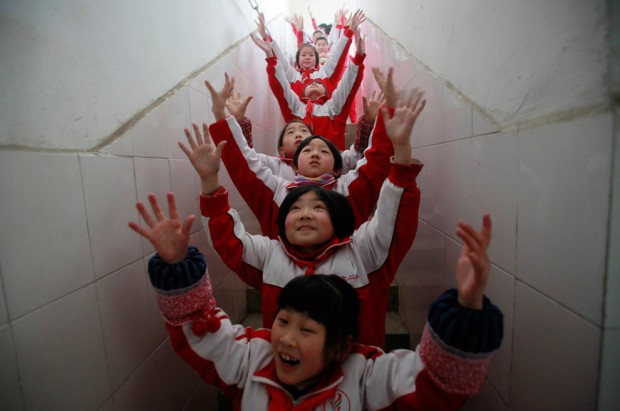 Дети занимаются физкультурой в здании школы в городе Цзинань в провинции Шаньдун, 14 января 2013 года. Власти порекомендовали местным жителям оставаться в помещениях, чтобы не дышать загрязнённым воздухом. (China Daily/Reuters)