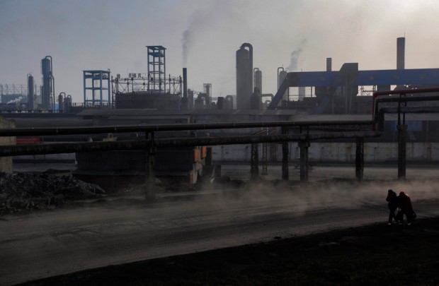 Люди проходят мимо завода химической компании «Jinhuarun Chemical Industry» в городе Zekou, в провинции Хубэй, Китай, 14 января 2013 года. За последние два года вокруг ряда городов в провинции Хубэй были построены 20 химических заводов, в связи с чем сильно возрос уровень шума, а также степень загрязнения воздуха и воды. (How Hwee Young/EPA)