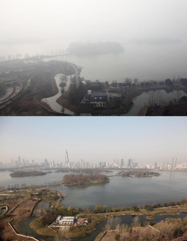 Туман над озером Xuanwu в городе Нанкин в провинции Цзянсу на востоке Китая 14 января 2013 года, и это же озеро в ясный день 31 марта 2012 года. (AFP/Getty Images)