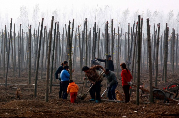 Местные жители сажают деревья в надежде восстановить почву возле государственного завода по выплавке свинца в городе Tianying в провинции Аньхой, 19 ноября 2012 года. (David Gray/Reuters)