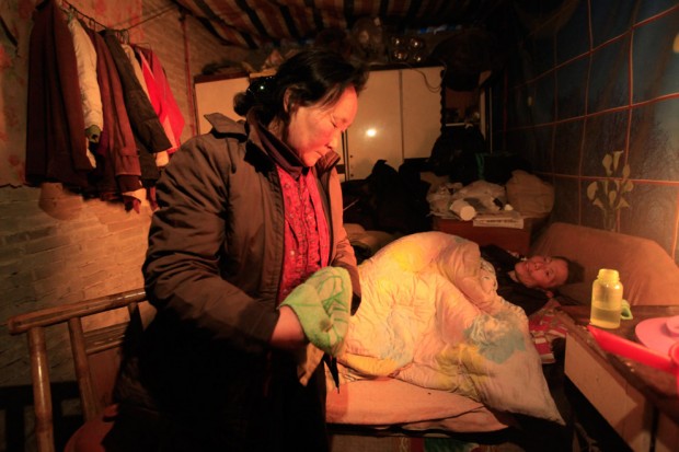 Женщина ухаживает за своим мужем, который болеет раком лёгких в терминальной стадии, в деревне Xiangnan, 14 января 2013 года. Она считает, что причиной его заболевания стало загрязнение окружающей среды, возникшее в результате деятельности местного химического завода. Сейчас мужчина даже не может нормально отдохнуть, так как постоянный шум фабрик мешает ему спать. (How Hwee Young/EPA)