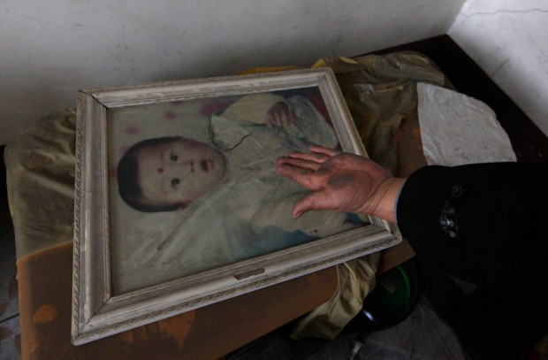 Житель деревни Xiangnan вытирает пыль с портрета своего внука, которого увезли из деревни, чтобы уберечь от воздействия загрязнения, возникшего в результате деятельности местных химических заводов, 15 января 2013 года. (How Hwee Young/EPA)