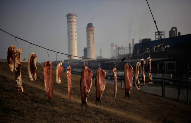 Мясо сушится возле завода компании «Jinhuarun Chemical Industry» в индустриальном парке в городе Zekou в провинции Хубэй, 14 января 2013 года. Местные жители жалуются на учащение случаев заболевания органов дыхания, сердца, кожи и системы кровообращения. (How Hwee Young/EPA)