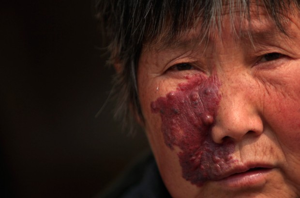 Жительница деревни Dongtan страдает от кожного заболевания, которое усугубилось с годами из-за загрязнения окружающей среды, возникшего в результате деятельности местного химического завода в городе Zekou в провинции Хубэй, Китай, 15 января 2013 года. (How Hwee Young/EPA)