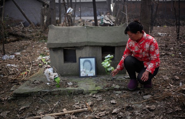 Женщина принесла цветы на могилу своей матери, которая умерла от рака горла в прошлом году, в городе Zekou в провинции Хубэй, Китай, 15 января 2013 года. (How Hwee Young/EPA)