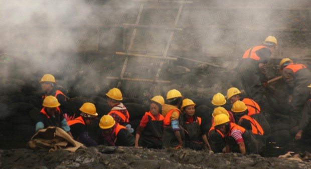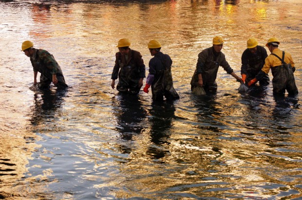 Рабочие чистят сильно загрязнённую реку Нанмин в округе Гуйян в провинции Гуйчжоу на юго-западе Китая, 17 ноября 2012 года. (AFP/Getty Images)