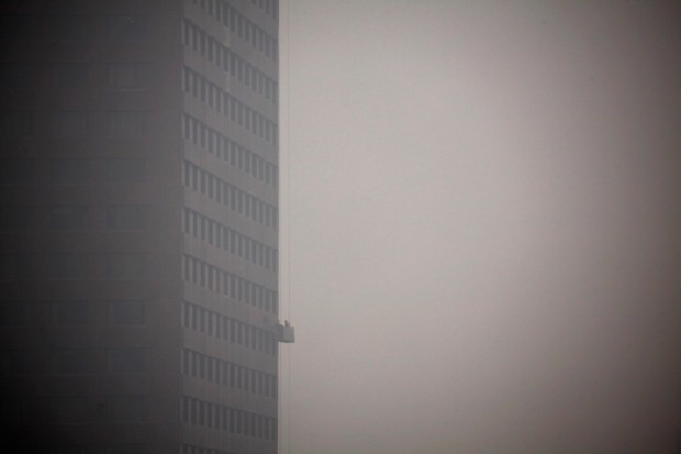 Мойщики окон работают в густом тумане в Пекине, 26 октября 2012 года. К 2015 году Пекин планирует уменьшить уровень загрязнения на 15% путём поэтапного отказа от использования старых автомобилей, вытеснения заводов из города и высадки новых лесов. К 2020 году уровень загрязнения должен снизиться на 30%. (David Gray/Reuters)