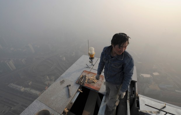Рабочий стоит на крыше здания в Хэфэе в провинции Аньхой, Китай, 14 января 2013 года. Китайские СМИ сообщили, что правительству пришлось принять срочные меры по борьбе с загрязнением воздуха. (Reuters)
