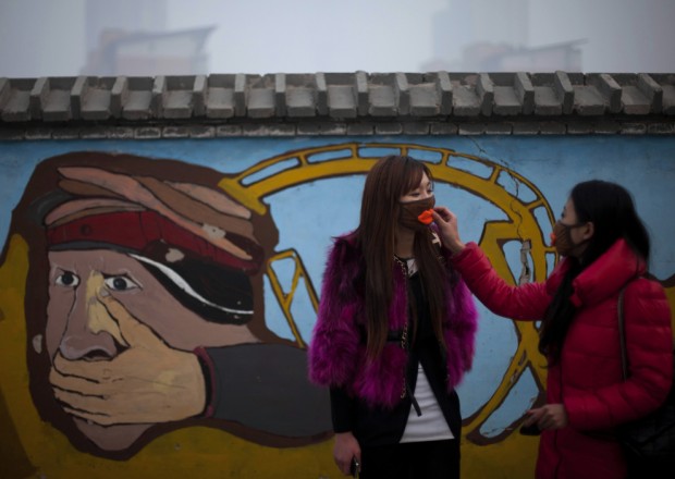 Женщина поправляет подруге защитную маску возле парка развлечений в Пекине, 12 января 2013 года. Степень загрязнения в столице Китая достигла опасного уровня. Власти рекомендовали гражданам не выходить из своих домов. (Alexander F. Yuan/Associated Press)