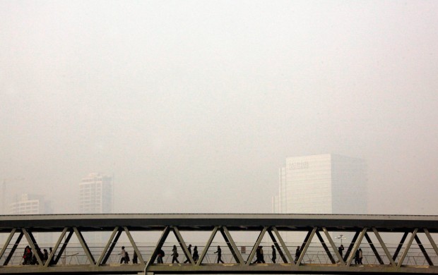 Пешеходы идут по мосту над автомагистралью в центре Пекина, 27 октября 2012 года. К 2015 году Пекин планирует уменьшить уровень загрязнения на 15% путём поэтапного отказа от использования старых автомобилей, вытеснения заводов из города и высадки новых лесов. К 2020 году уровень загрязнения должен снизиться на 30%. (David Gray/Reuters)