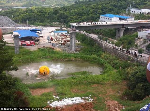 Шар диаметром 4 метра благополучно скатился с холма, угодил в мелкое озеро и… дал течь.