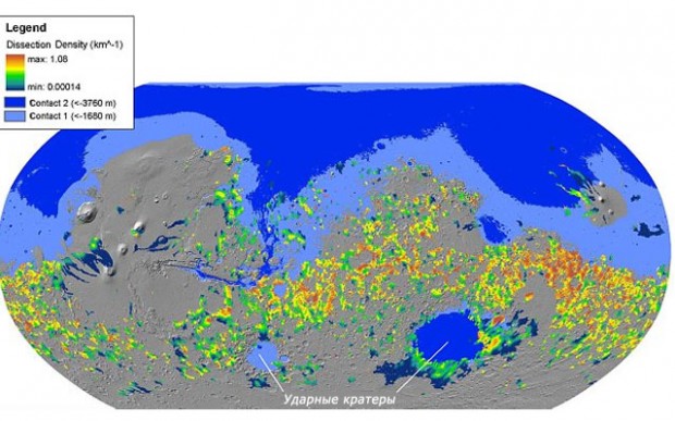 Голубая область — предполагаемый марсианский океан. Желтые, красные и зеленые области – долины, образованные водными потоками, текущими с юга к океану на севере