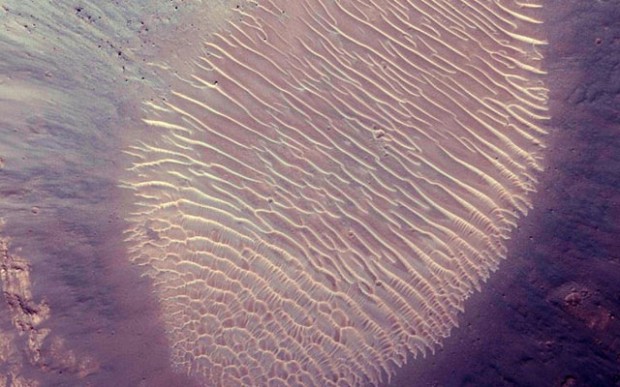 Это изображение, похожее на отпечаток пальца, было снято в районе долин Маринер. Предполагается, что эту форму ландшафт принял благодаря испарившейся когда-то воде