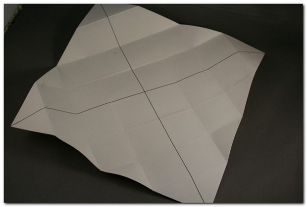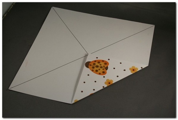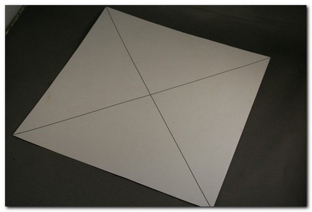 1. Для начала делаем крышечку от коробки. Берём отрезок бумаги размером 21.5х21.5 см. и расчеричиваем её по диагонали. Линии идут от одного угла к противоположному.