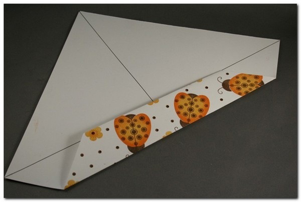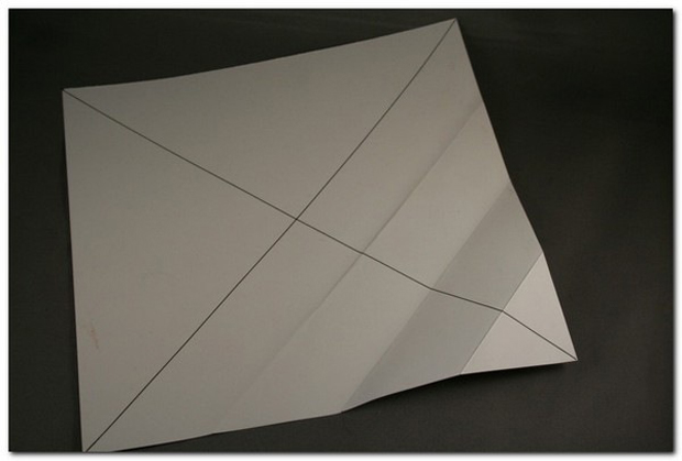 2. Один из углов сгибаем так, чтобы он смотрел в самый центр. Затем сгибаем его еще раз, чтобы уже край этого сгиба шёл вровень с расчерченной полосой по центру.