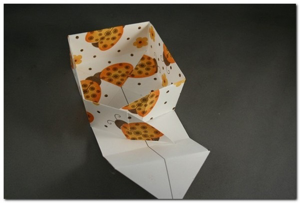 6. После того, как крышка от коробочки готова, нужно сделать её дно из отрезка бумаги размером чуть менее 21.2х21.2 см. Дно делается таким же образом, как и крышечка. В данном случае используется однотонная бумага.