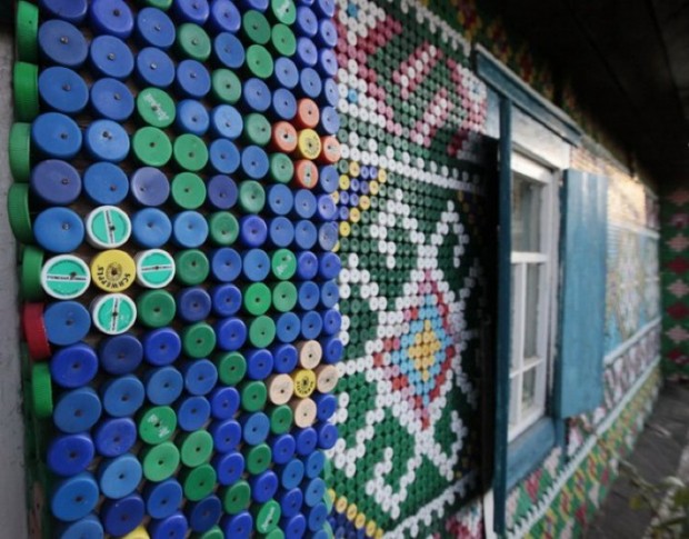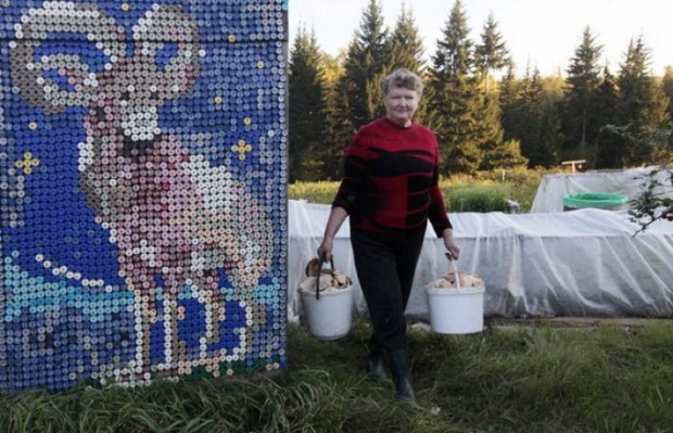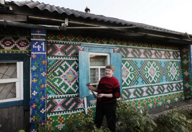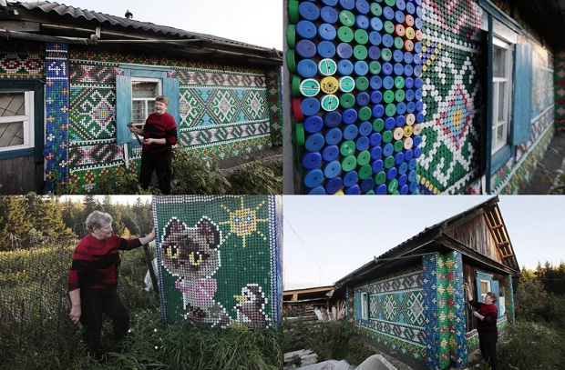Российская пенсионерка Ольга Костина (Olga Kostina) не выбрасывает пробки из-под бутылок уже много лет. Этим крышкам она нашла оригинальное применение, украшая ими фасад собственного дома. Получилась мозаика из 30000 крышек, прибитых гвоздями. Ольга Костина живет в тайге, в одном из сел Красноярской области.