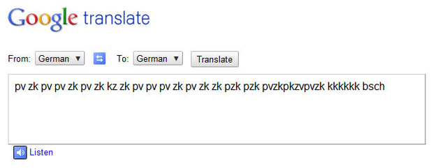 Если с помощью переводчика translate.google.ru вы переведёте фразу pv zk bschk pv zk pv bschk zk pv zk bschk pv zk pv bschk zk bschk pv bschk bschk pv kkkkkkkkkk bschk с любого языка на немецкий, вы увидите, что кнопка «Прослушать» превратилась в кнопку Beatbox! Нажмите её и получите настоящий битбокс от гугла.