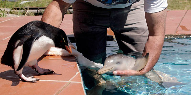 5. Большой хохлатый пингвин с интересом смотрит на спасенного дельфиненка в его новом доме — морском заповеднике, расположенном в городке Пунта Колорада, в уругвайском департаменте Мальдонадо.