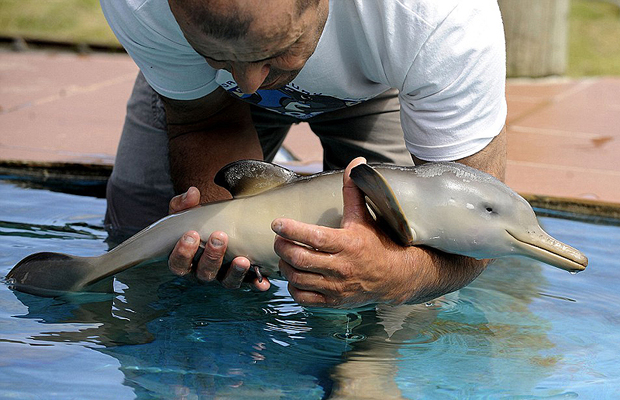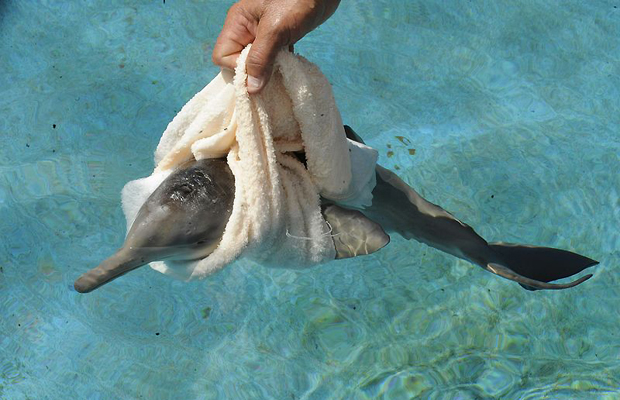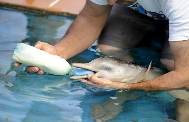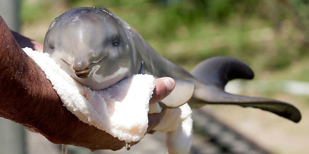 2. Судя по всему, этому малышу всего лишь 10 дней от роду. К сожалению, мать маленького дельфина найти не удалось, поэтому работники организации «SOS Fauna Marina» выкармливают его молоком из бутылки.