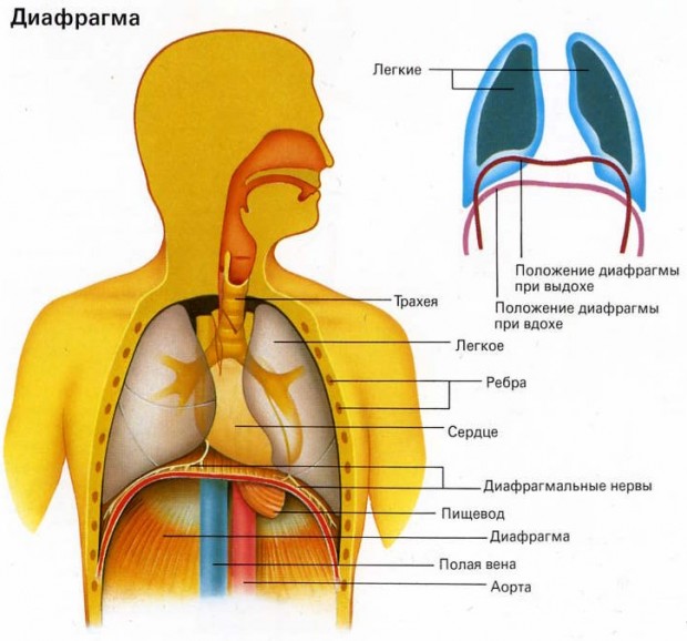 Сжатие этого нерва чревато нарушением функций очень многих органов, поэтому организм быстро и активно реагирует на возникшее неудобство. Он посылает сигнал в центральную нервную систему. А она, в свою очередь, активирует диафрагмальный нерв, отвечающий за сокращения диафрагмы.
